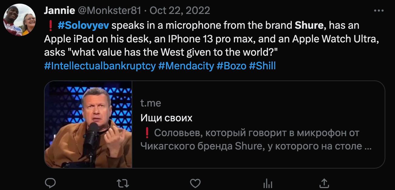 Russian propagandist Soloviev is expressing his hatred to the West using Western technology (screen fom Julia Davies Twitter)