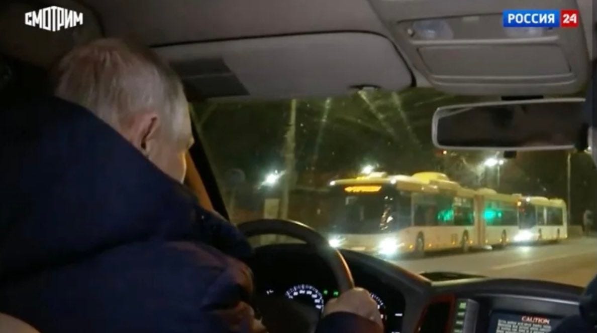 Putin in Mariupol in a car that is definitely NOT made in Russia - still from video via Russia24