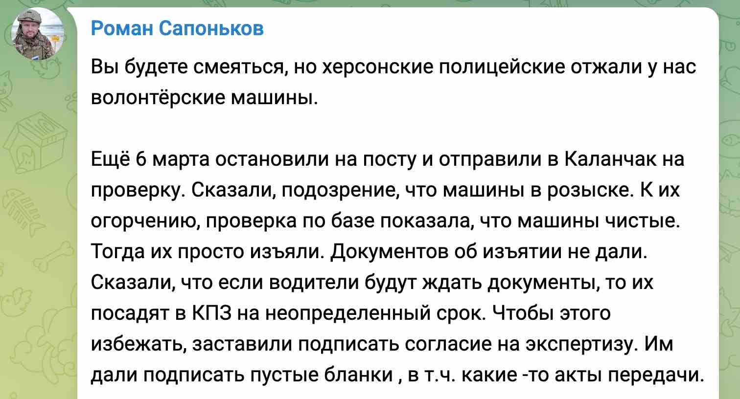 “You gonna laugh, but Kherson police took our volonteer vehicles”, that’s how Roman Saponkov begins his story. He was right, I laughed (via RSaponkov on Telegram)